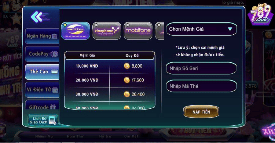 Một trong những yếu tố được người chơi yêu thích nhất tại 789Club là tốc độ giao dịch. Nạp và rút tiền được thực hiện hoàn toàn tự động, chỉ mất vài giây là hoàn tất. Hệ thống hỗ trợ nhiều phương thức như: ngân hàng nội địa, ví điện tử, thẻ cào và mã QR. Mọi giao dịch đều minh bạch, không mất phí ẩn và hoạt động 24/7.