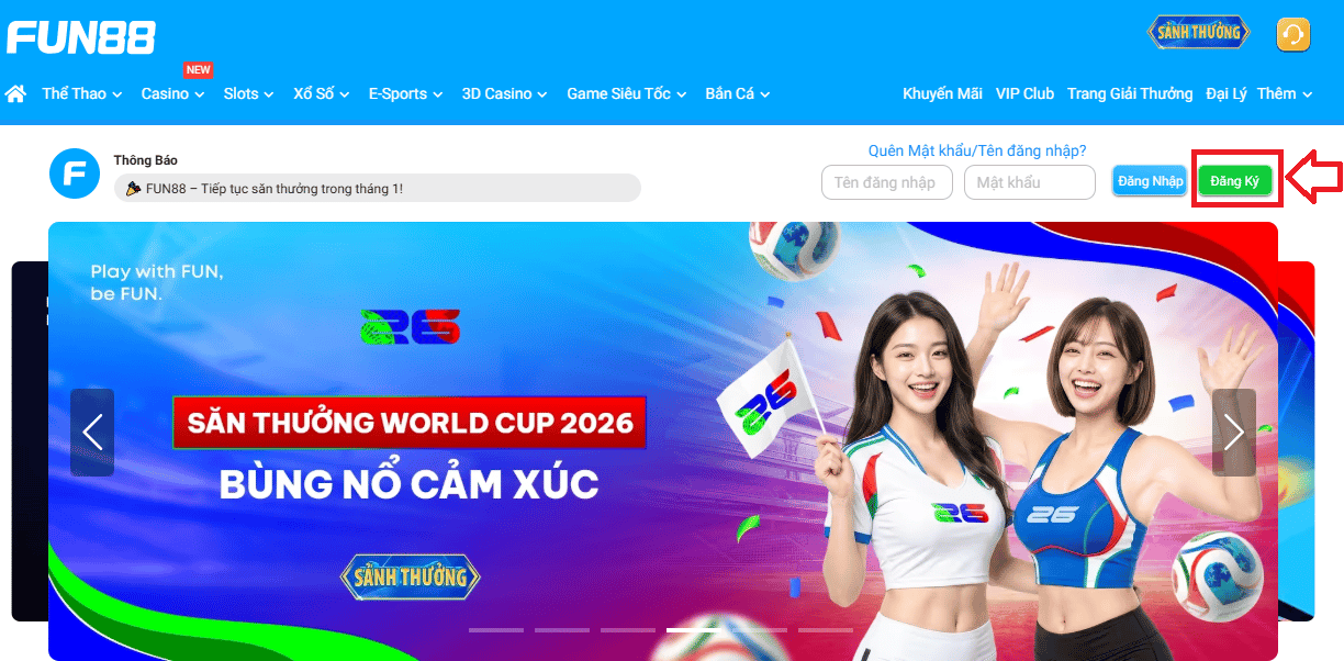 Các bạn truy cập link vào Fun88 mới nhất của nhà cái Fun88 được chia sẻ ở bên trên. Ở góc phải màn hình website, nhấn chọn Đăng Ký chữ trắng nền xanh lá cây để xác nhận mở tài khoản Fun88.