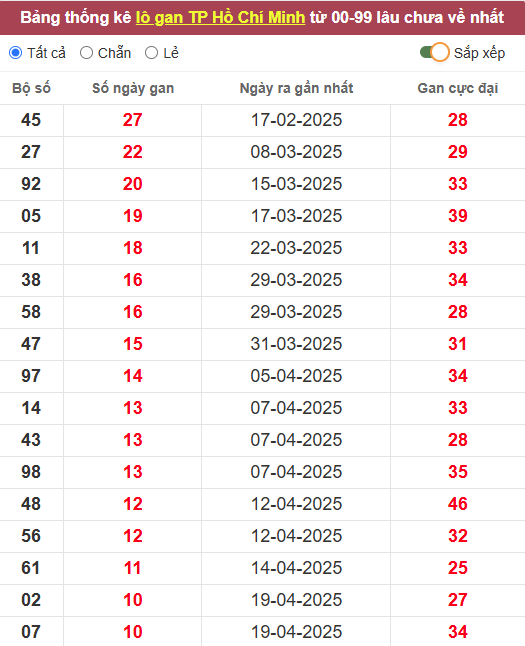 Dưới đây là tổng hợp số liệu thống kê kết quả XSTP HCM bao gồm thống kê lô gan, các bộ số lô tô xiên về nhiều, thống kê tần suất 2 số cuối giải đặc biệt của XSHCM để giúp người chơi dễ dàng phân tích và chọn ra những bộ số may mắn nhất ngày hôm nay