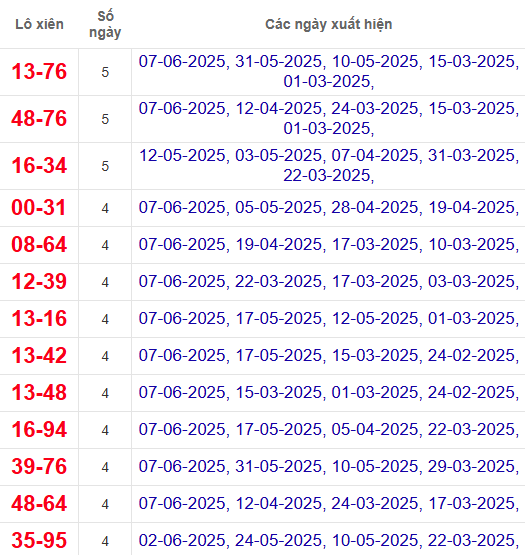 2. Bảng thống kê cặp lô xiên 2 hay về nhất