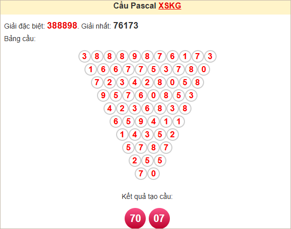 Thống kê cầu pascal xổ số KG tính theo công thức Pascale trong toán học dựa theo dữ liệu bảng kết quả ngày quay gần nhất giúp người chơi dễ dàng tính toán để chọn ra những bộ số may mắn của ngày hôm nay