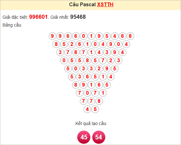 ⭐️ Kết quả nhận được từ soi cầu Pascale là cặp song thủ lô: 45 - 54