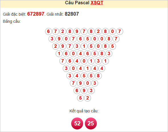 ⭐️ Kết quả từ soi cầu Pascale là cặp số lộn: 52 - 25